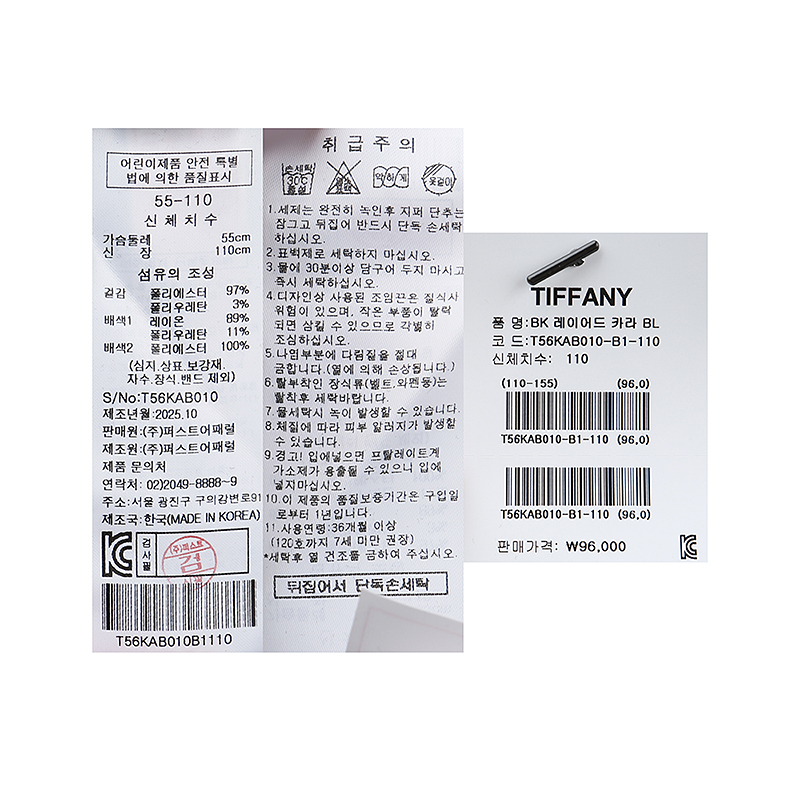 겉감 : 폴리에스터 97 폴리우레탄 3 배색 1 레이온 89 폴리우레탄 11 배색 2 폴리에스터 100