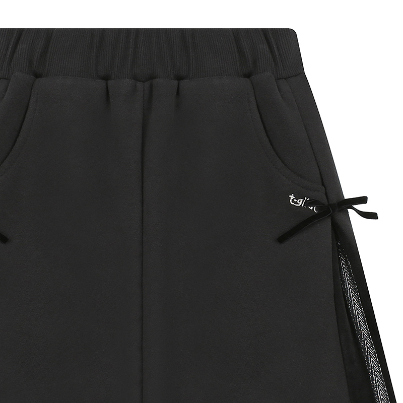 와이드한 핏의 다이마루 팬츠로 옆 주름 라인에 벨벳 소재와 TAPE장식을 포인트로 주어 고급스러운 느낌을 주는 스타일입니다. 옆 라인에 블랙 벨벳 리본 장식으로 귀여운 포인트를 주었습니다. 와이드 핏으로 밑단에 스트링 스토퍼로 조여줄 수 있는 스타일입니다.