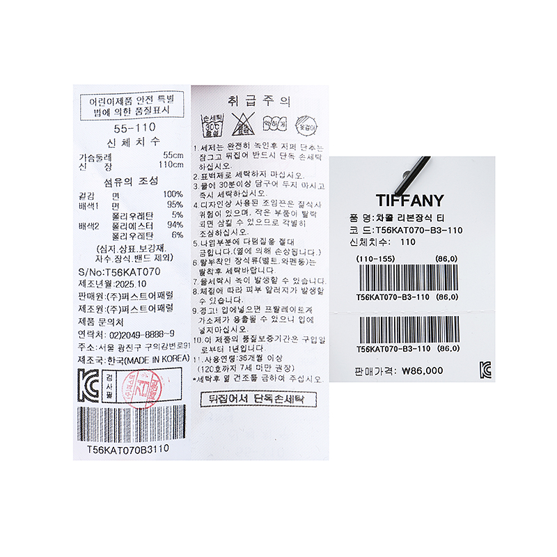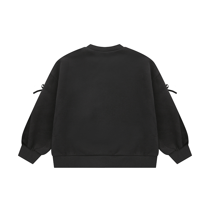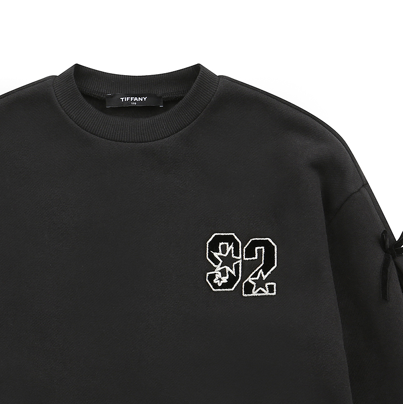 박시한 스타일의 티셔츠로 소매 주름 부분에 벨벳 소재와 TAPE장식을 포인트로 주어 고급스러운 느낌을 주는 스타일입니다. 소에 블랙 벨벳 리본 장식으로 귀여운 포인트를 주었습니다. 가슴에 벨벳 자수로 고급스럽게 포인트를 주었습니다.