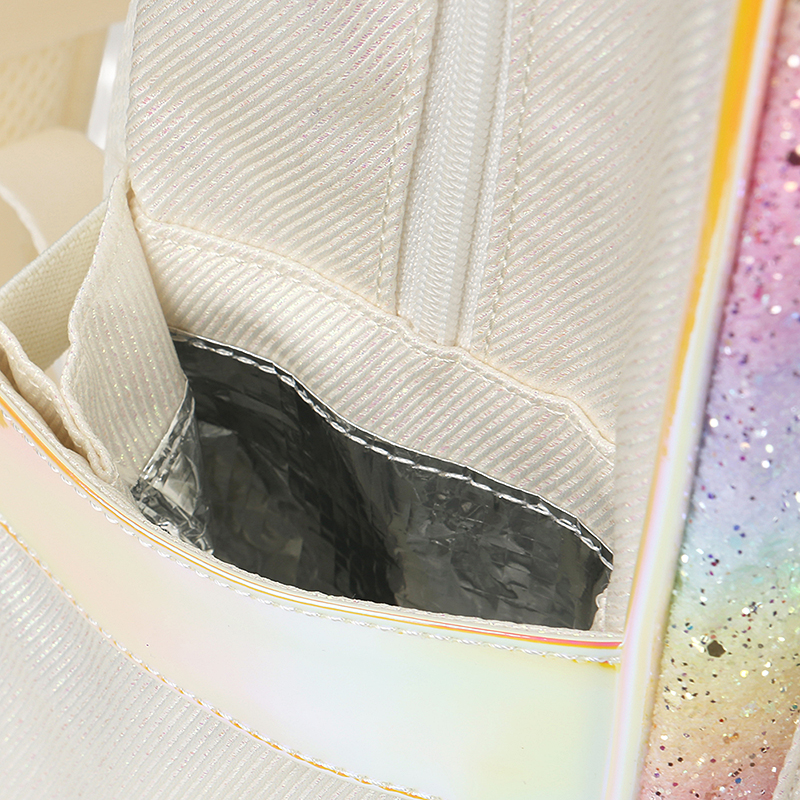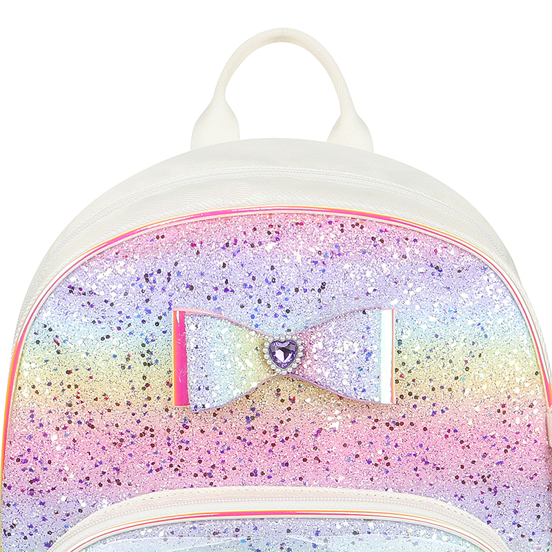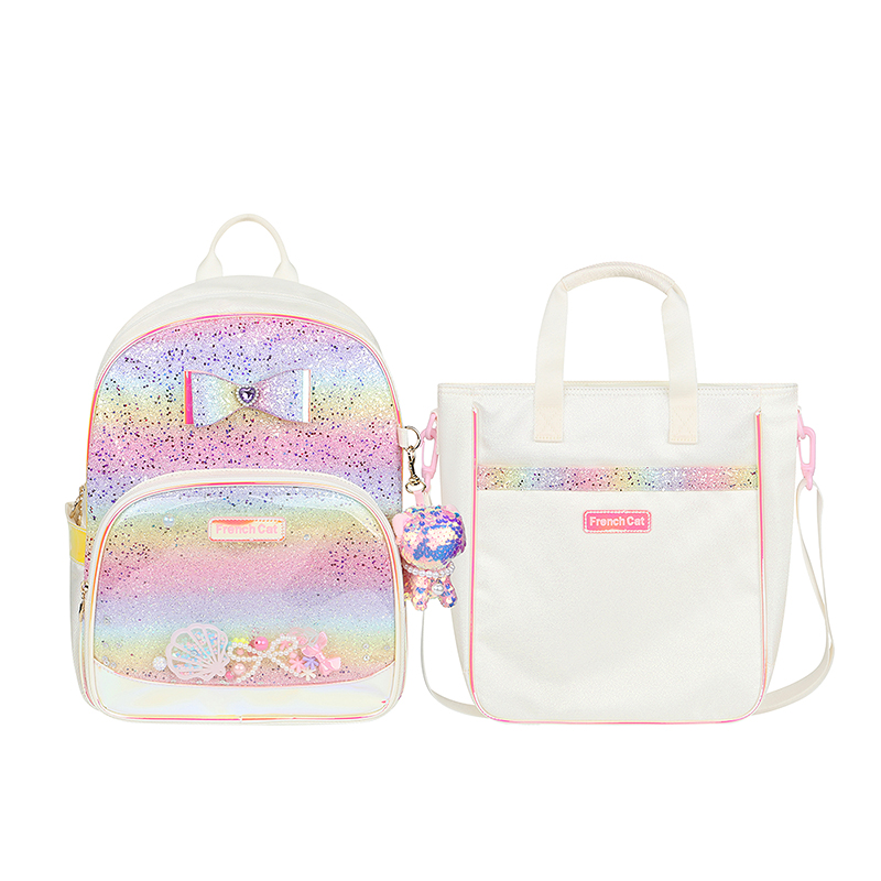 아이보리 바탕에 레인보우 펄(글리터) 배색이 더해져 한눈에 화사한 무드를 완성해주는 여아 책가방입니다.