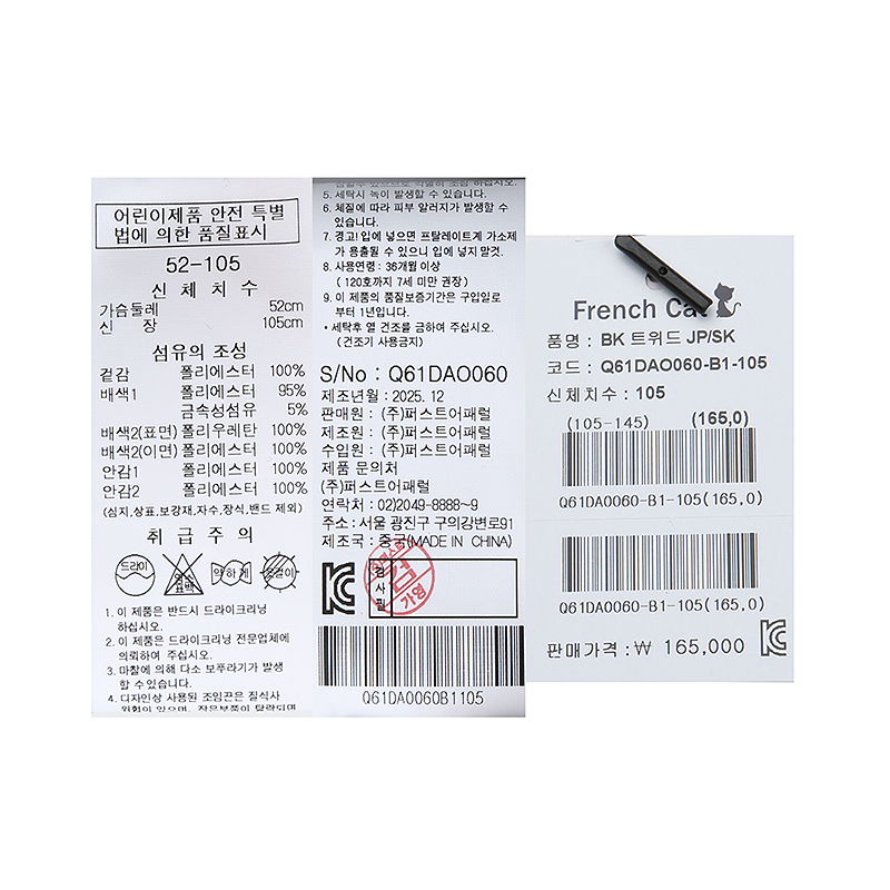 겉감 폴리에스터100배색1 폴리에스터95 금속성섬유5배색2 표면 폴리우레탄100/이면 폴리에스터100안감1 폴리에스터100안감2 폴리에스터100 -