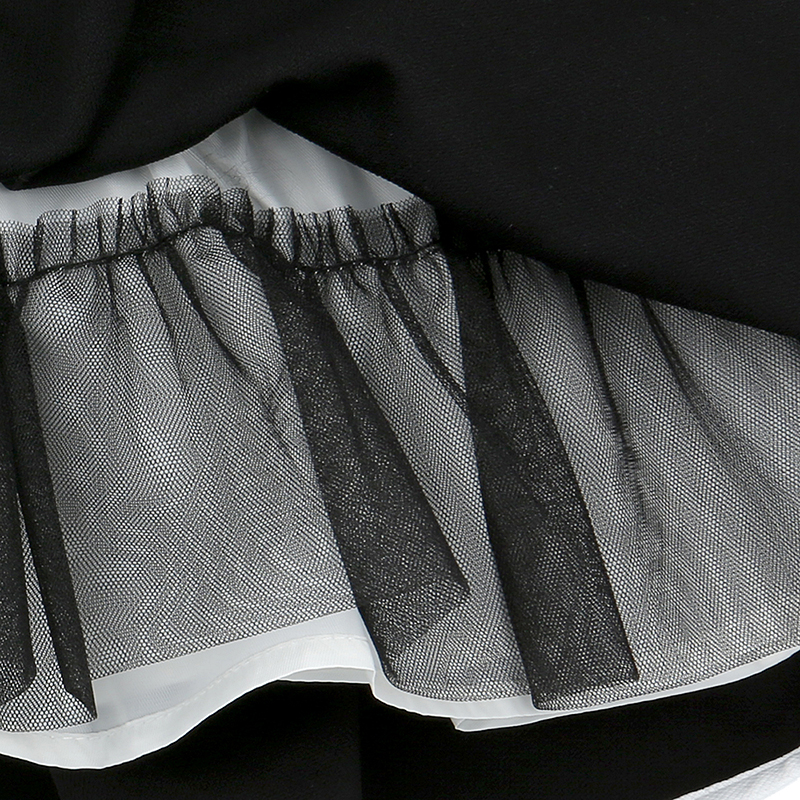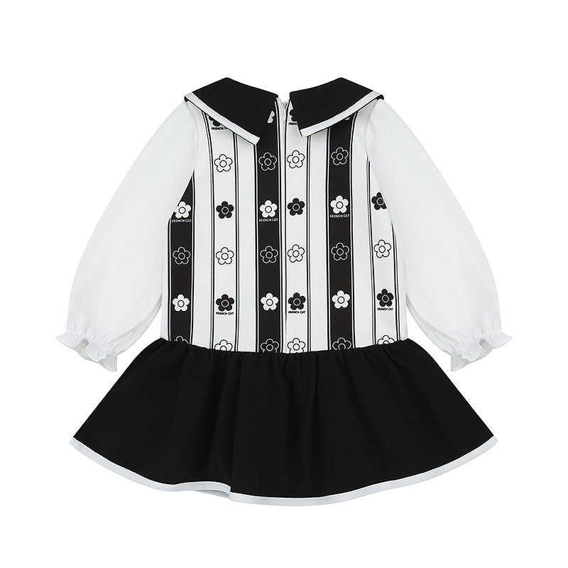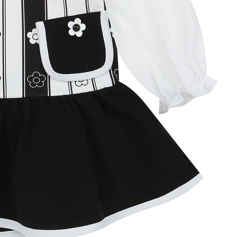 허리라인 아래로 자연스럽게 퍼지는 셔링 스커트와 배색 랍빠 마감이 고급스러운 볼륨을 선사합니다.