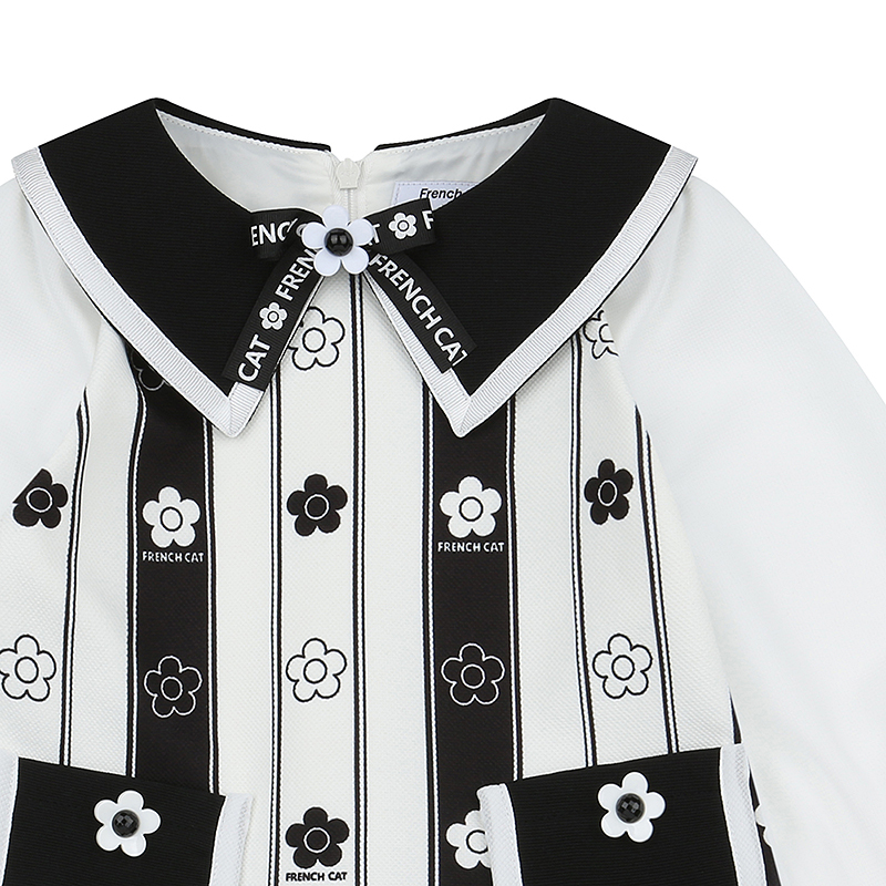 세로 스트라이프 패턴에 앙증맞은 꽃 프린트를 더해 클래식하면서도 위트 있는 룩을 완성해 주었습니다.