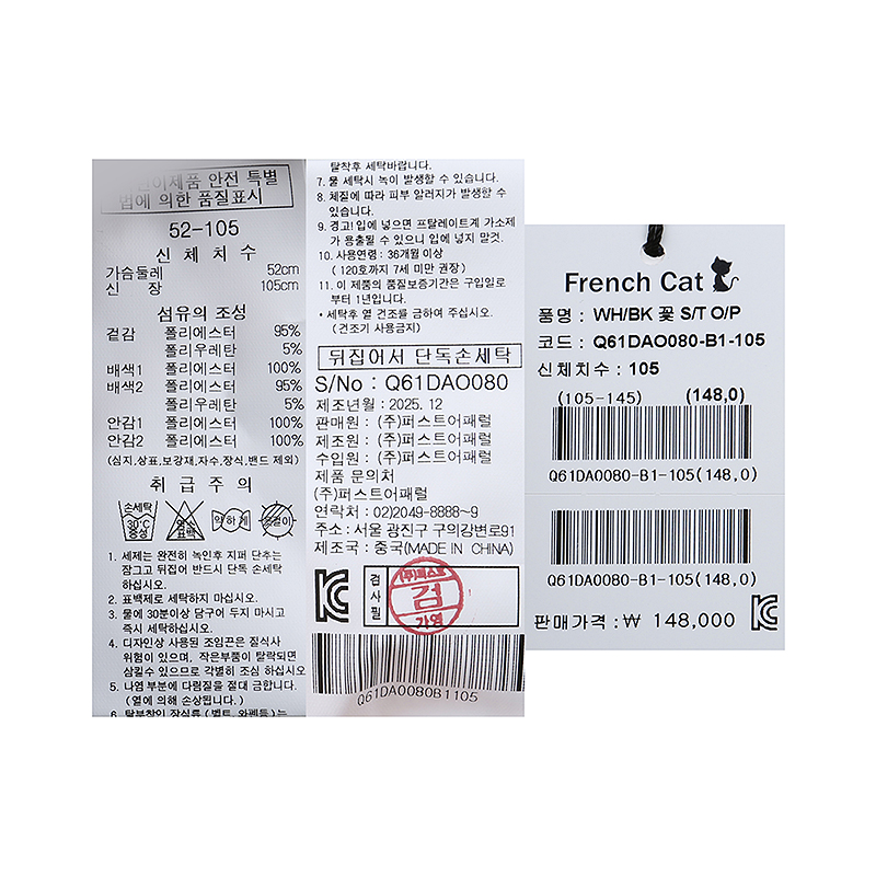 겉감 폴리에스터95 폴리우레탄5배색1 폴리에스터100배색2 폴리에스터95 폴리우레탄5안감1 폴리에스터100안감2 폴리에스터100 -