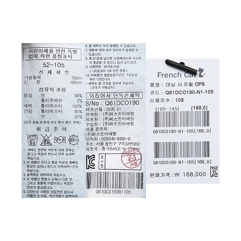 겉감 면98 폴리우레탄2배색 폴리에스터100안감 폴리에스터80 면20 -